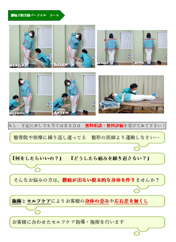 ※腰痛予防実践パーソナルコースは前日までの完全予約制(10分簡易施術は除く)