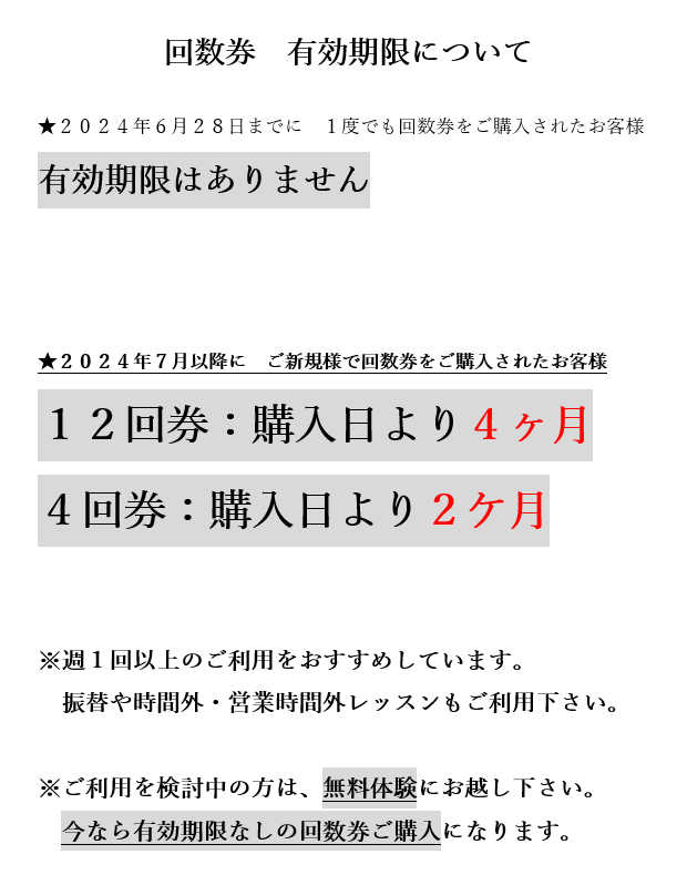 今回下記(写真)の様に12回券・4回券に有効期限を設けさせて頂きました。振替なども利用してお客様の健康維持の為にも週1回以上の運動に取り組んで行きましょう。